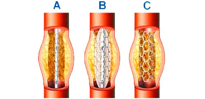 La angioplastía es procedimiento mediante el cual, a través de un catéter (dispositivo que puede introducirse en una vena o arteria), se coloca diminuto balón inflable rodeado por una malla metálica (stent) a la zona en que la vía sanguínea está obstruida (A).