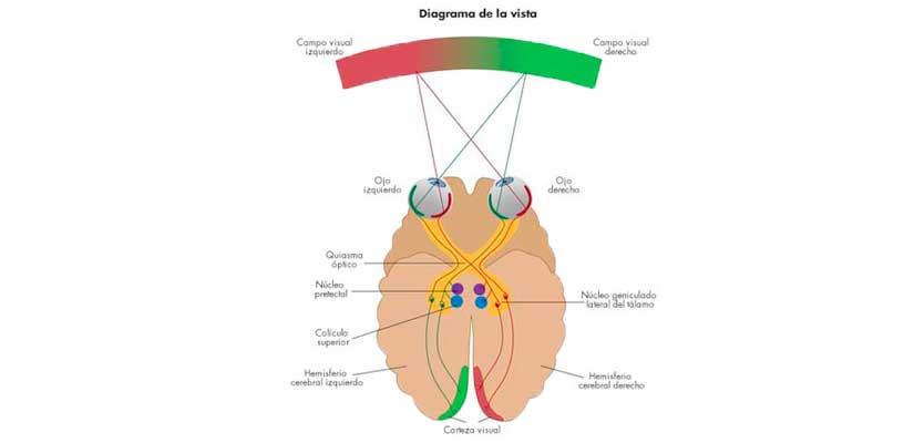 - Quiasma óptico. Estructura del cerebro en forma de X donde se entrecruzan parcialmente las fibras de los nervios ópticos, es decir, la mitad de ellas pasan del nervio óptico derecho a la cinta óptica izquierda, y viceversa. Gracias al quiasma óptico, las imágenes formadas en cada retina se cruzan al lado opuesto del cerebro, lo que permite que las imágenes de cada lado del campo visual (izquierdo y derecho) se transmitan al lado apropiado del cerebro.