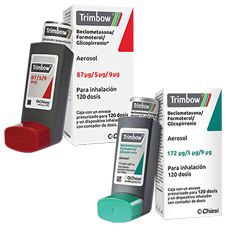 TRIMBOW® 87 µg/5 µg/9 µg y 172 µg/5 µg/9 µg están indicados para el tratamiento de mantenimiento del asma en pacientes a partir de los 18 años, que no están adecuadamente controlados con una combinación de agonista beta2 de acción prolongada y corticoesteroide inhalado en dosis media y que han experimentado una o más exacerbaciones asmáticas en el año anterior.