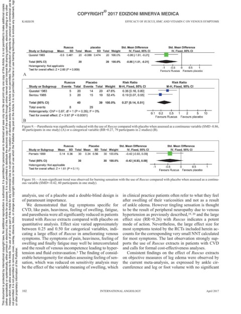 Figure 9.—Paresthesia was significantly reduced with the use of Ruscus compared with placebo when assessed as a continuous variable (SMD -0.86,