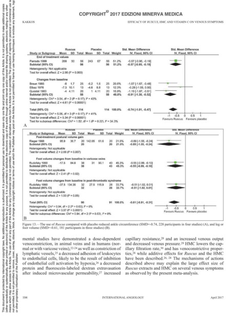 Figure 13.—the use of Ruscus compared with placebo reduced ankle circumference (SMD=-0.74, 228 participants in four studies) (a), and leg or