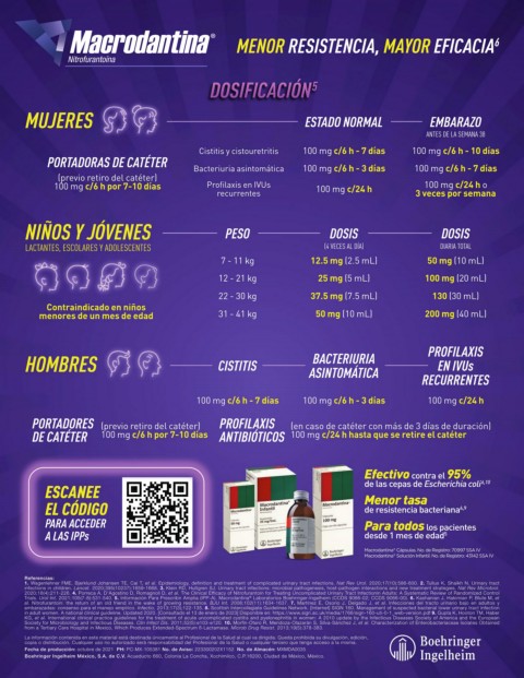 Trials. Urol Int. 2021;105(7-8):531-540. 5. Información Para Prescribir Amplia (IPP-A). Macrodantina ® Laboratorios Boehringer-Ingelheim (CCDS 9066-02; CCDS 9066-00). 6. Kashanian J, Hakimian P, Blute M, et